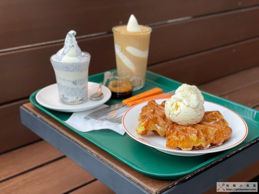 當然這裡的招牌肯定是冰淇淋咖啡,挑嘴小食堂當然不能錯過,但由於當天甜點只剩下可頌鬆餅,因此挑嘴小食堂就點了一個冰淇淋可頌鬆餅,另外還點了一杯芝麻冰淇淋佐濃縮咖啡,外觀有夠可愛的冰淇淋咖啡以及芝麻冰淇淋佐濃縮咖啡,這兩杯飲品都非常有水準,濃苦的黑美式咖啡搭配冰淇淋,讓咖啡不在苦澀,反倒是帶出咖啡的香濃,且不會讓人覺得甜膩,是一家讓人想再回訪的一家咖啡館!!